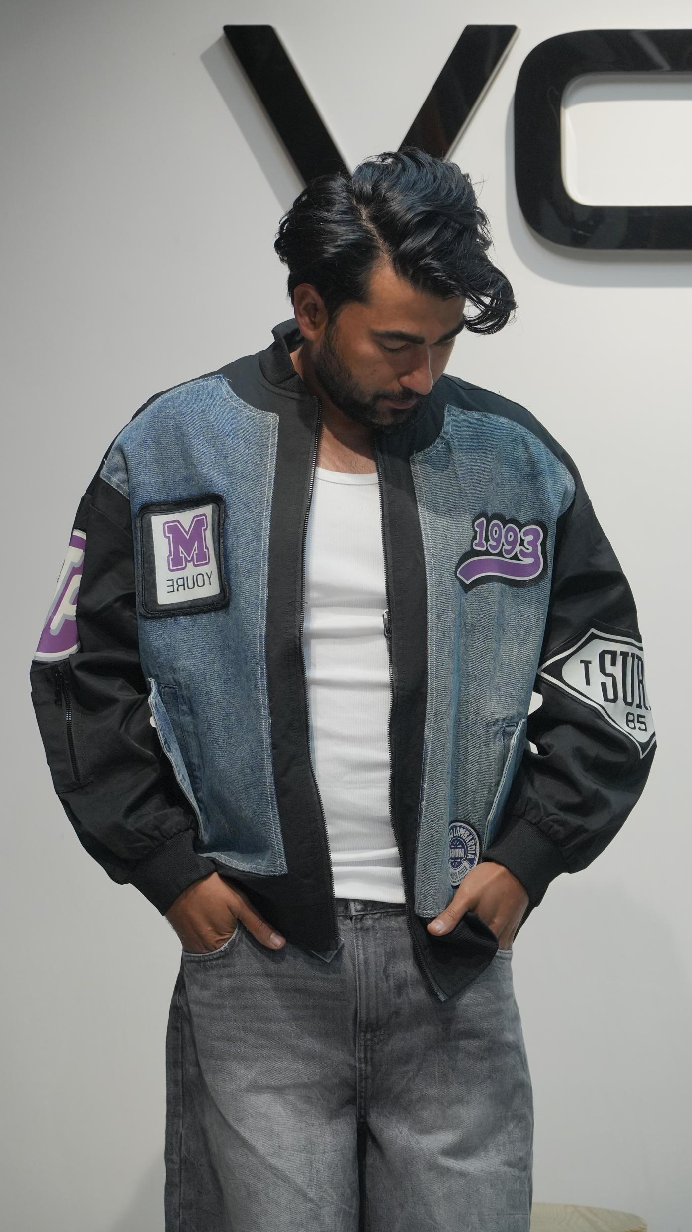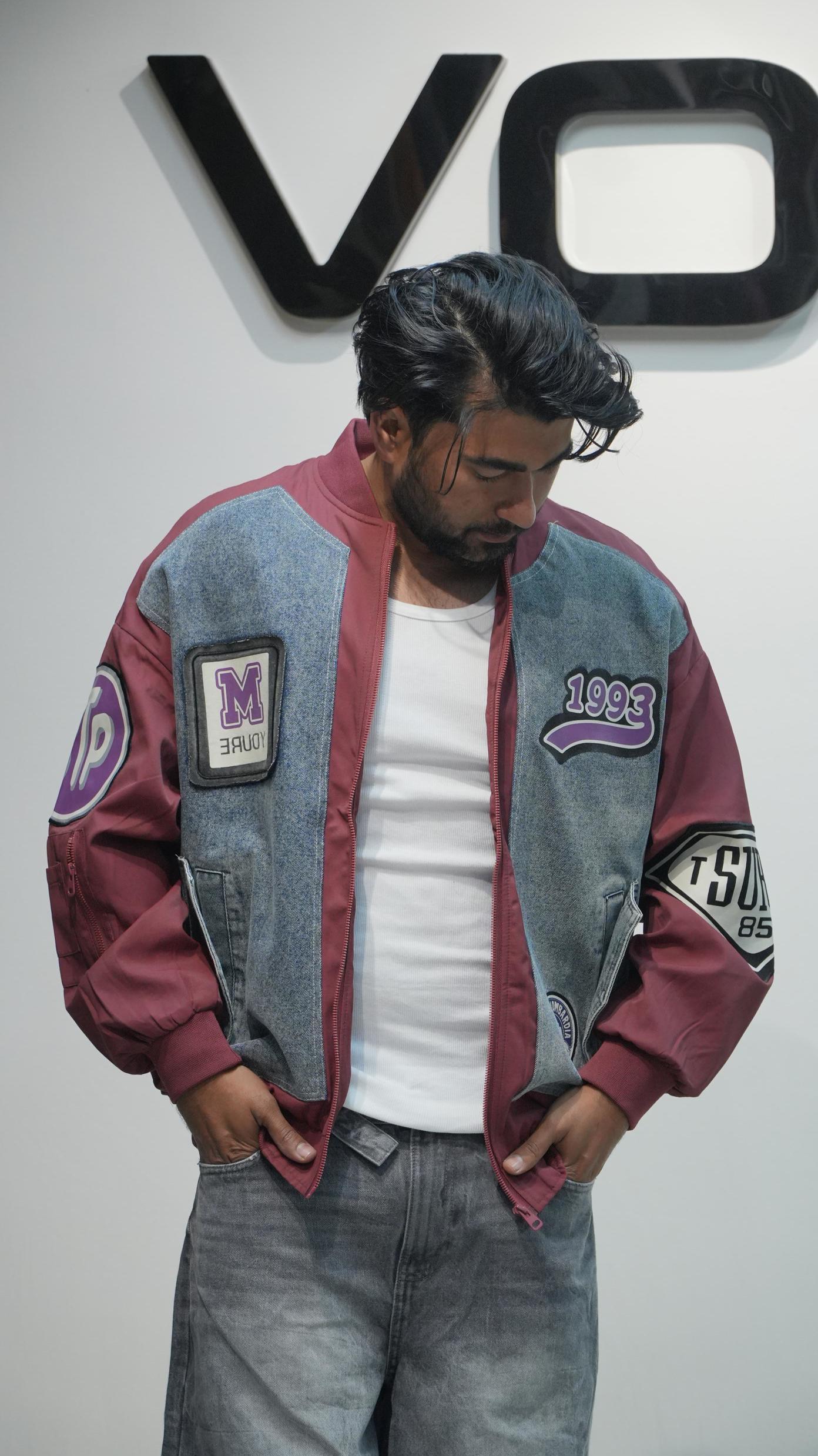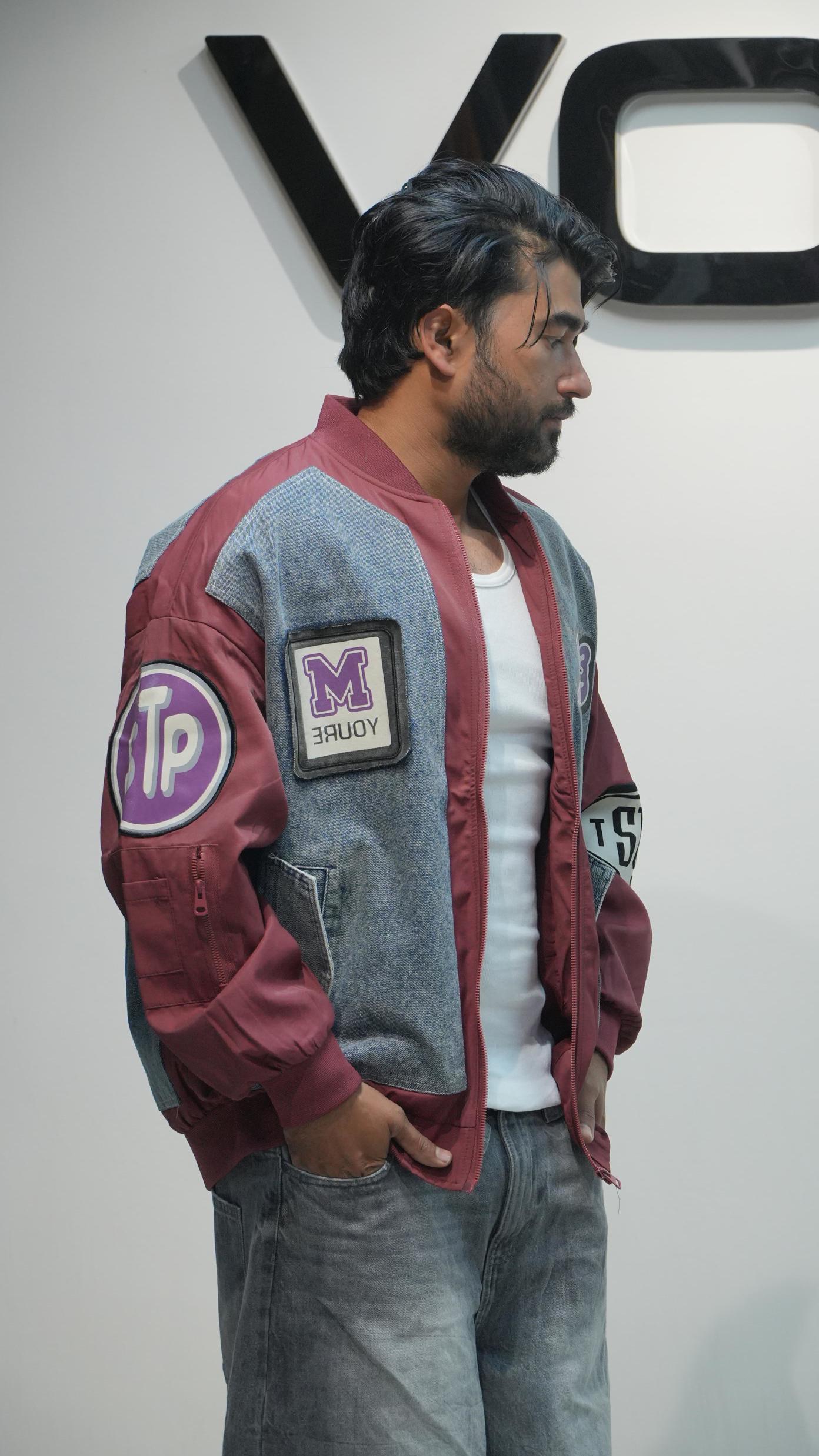Stand out in retro-inspired street style with the 1993 Varsity Bomber Jacket. This eye-catching piece combines faded blue denim panels with sleek maroon nylon accents for a premium patchwork look that blends classic varsity aesthetics with modern urban edge.
