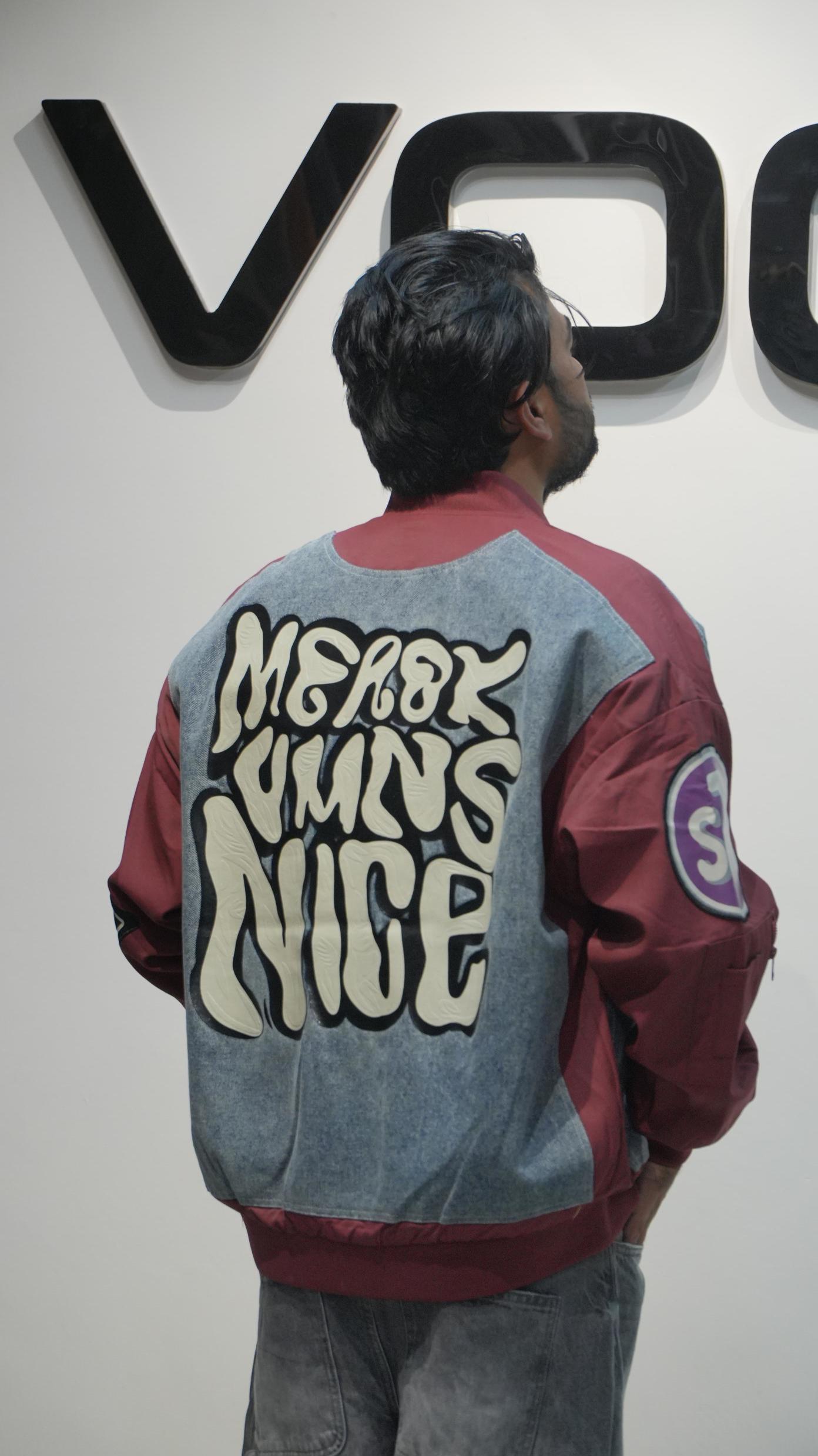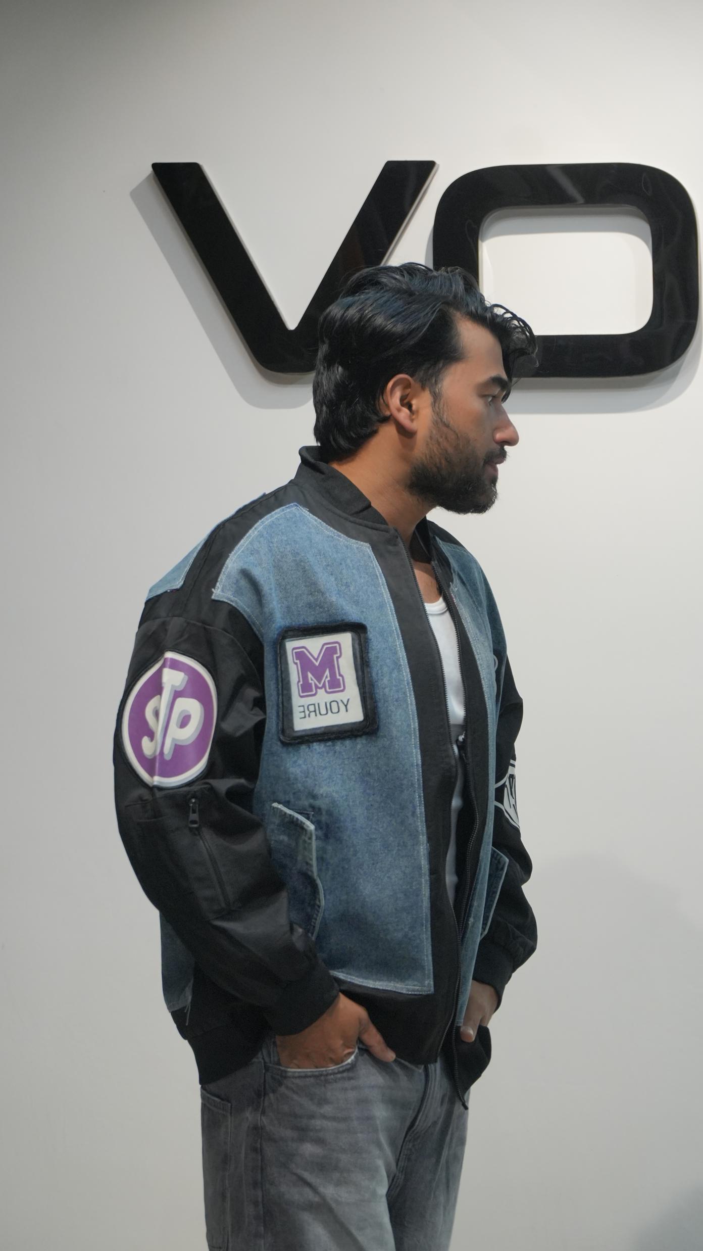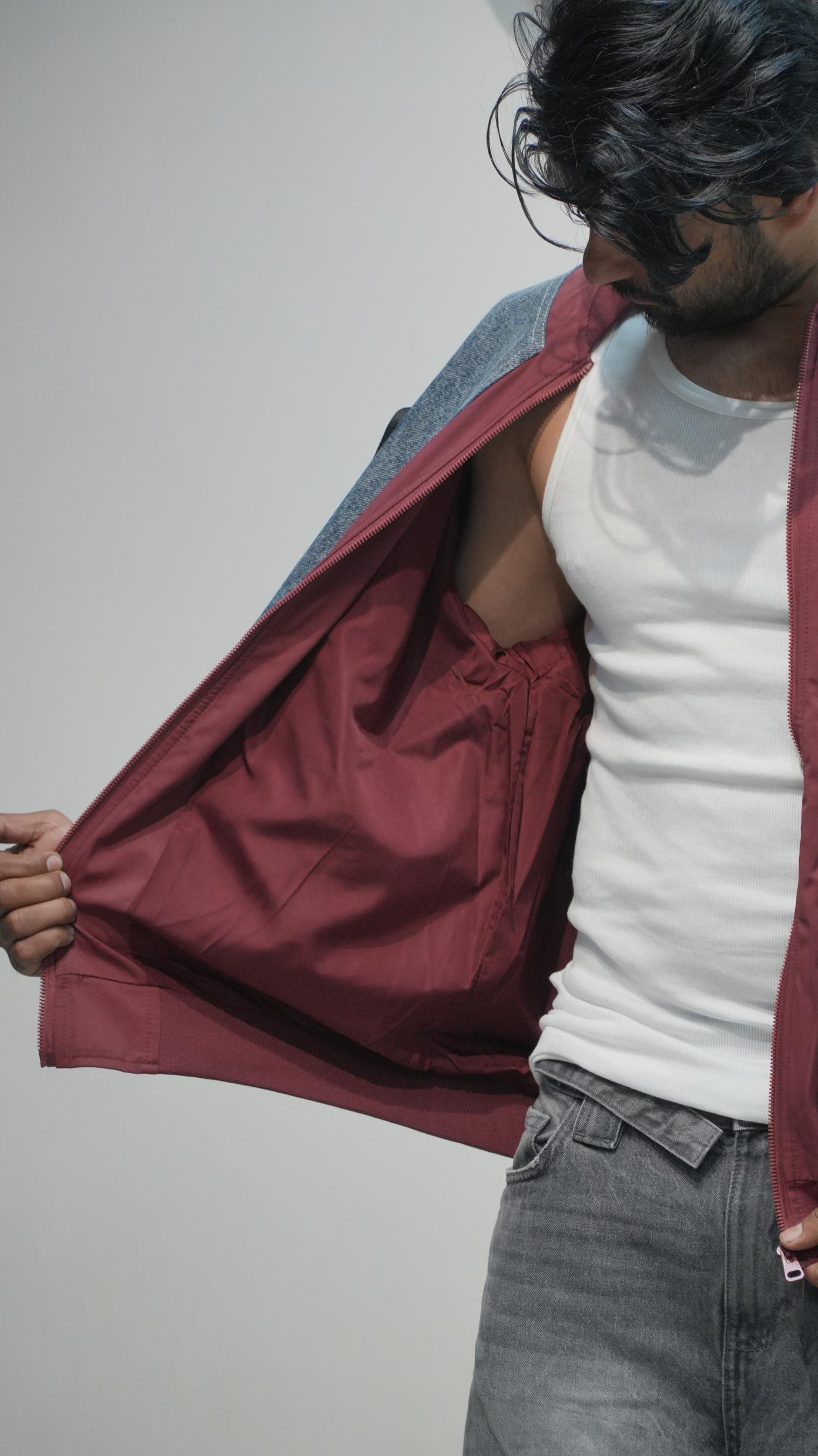 Stand out in retro-inspired street style with the 1993 Varsity Bomber Jacket. This eye-catching piece combines faded blue denim panels with sleek maroon nylon accents for a premium patchwork look that blends classic varsity aesthetics with modern urban edge.