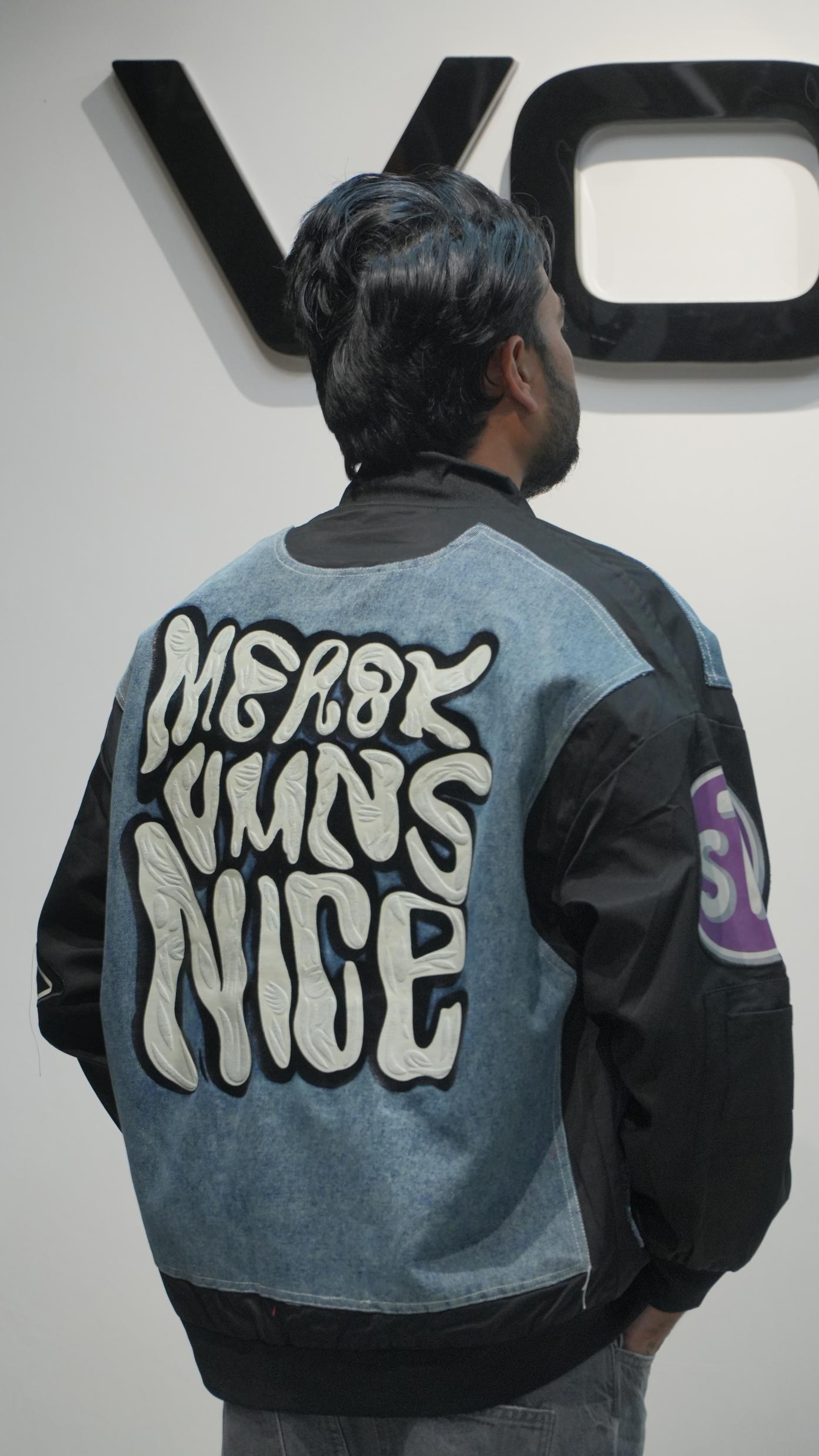 The oversized bomber silhouette features bold embroidered and puffed patches throughout: “1993” scripting, motivational badges like “M YOUR E”, route-style signs, and a large statement text on the back reading “NSPRY NWS NITE”. Purple highlights add a vibrant pop, while the full front zipper, ribbed cuffs, collar, and hem ensure a comfortable, secure fit.