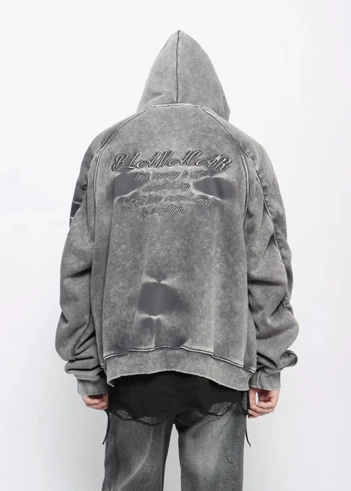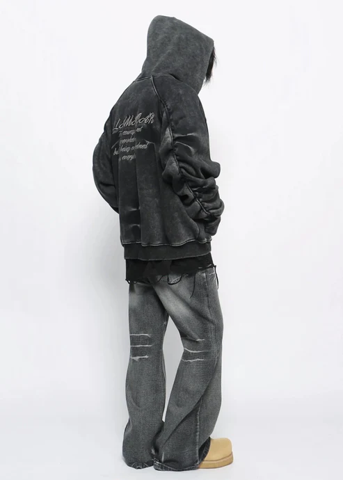 A hoodie that feels like it’s already lived a thousand nights. Cut from dense 480GSM cotton and put through an extreme acid-wash + overdyed treatment, resulting in deep charcoal-to-black tones with chaotic fading and raw, weathered textures. Each piece is subtly unique.