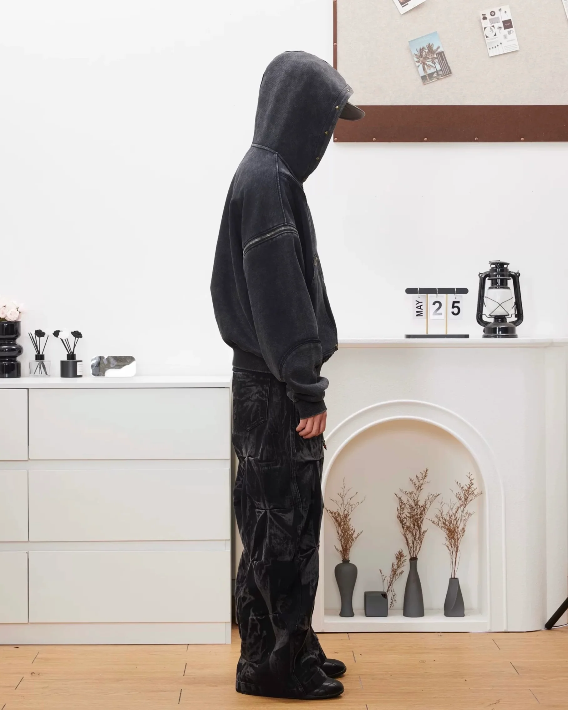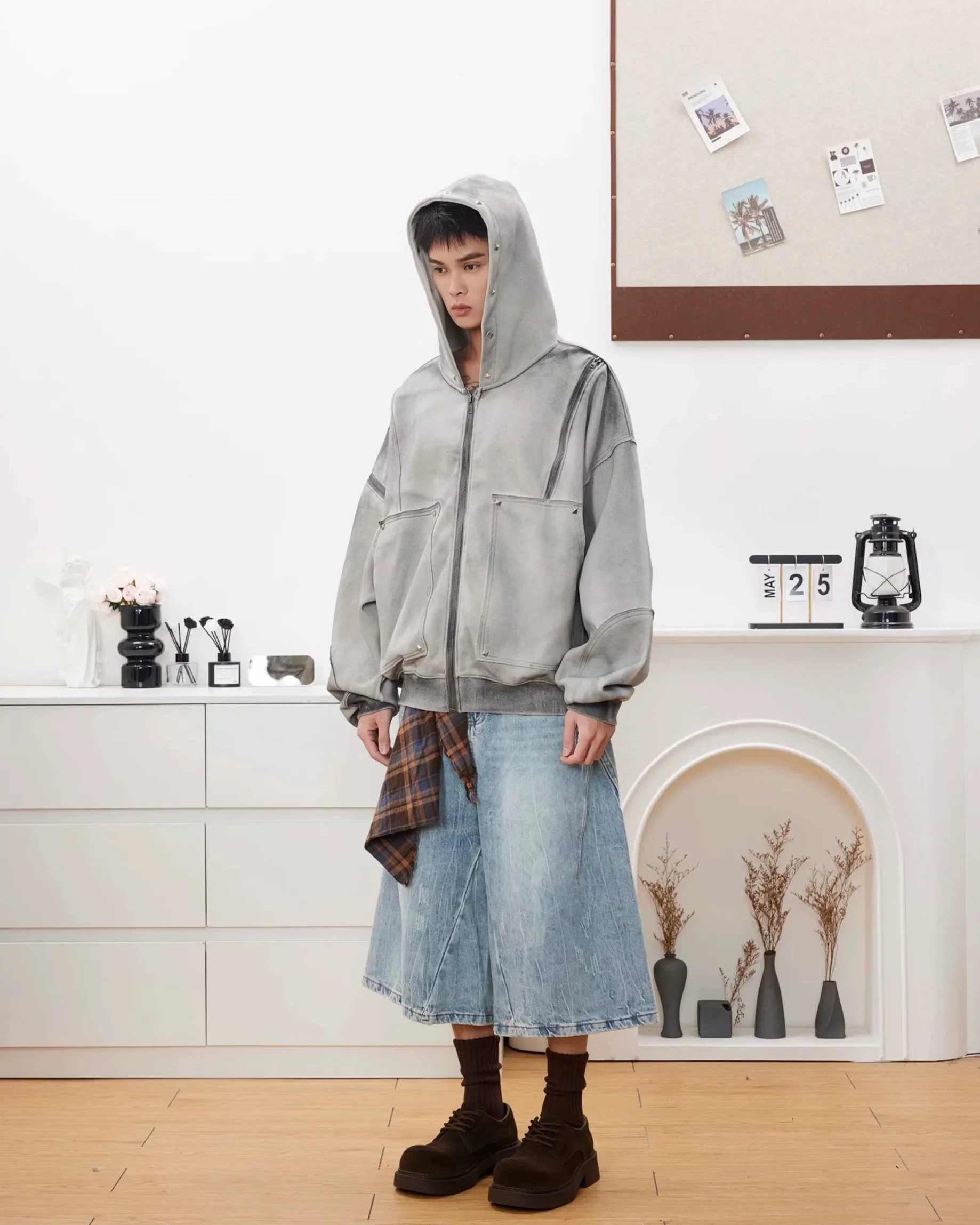 - Grunge Hardware: Accented with small, functional metal studs or rivets near the pockets and seams, adding a subtle industrial/grunge element.